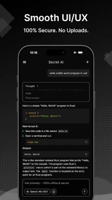 Experience private offline AI chat with no internet connection required. Secret AI is a secure local LLM chatbot and local AI assistant that runs entirely on your device - your conversations stay 100% private with zero data collection, no servers, no account required, no tracking, and completely anonymous.