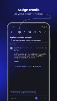 Get the right people involved and bring everyone up to speed fast with private team comments and live thread sharing. Assign emails to teammates to delegate next steps.