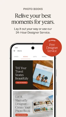 Our app features include: • Return & recipient address printing for all your envelopes so you can save a ton of time. • Our 24-Hour Photo Book Designer Service — now you can finish your book on the app with any edits you may have! Get started by simply uploading all your photos and let a Shutterfly designer place the best ones in your book for you. • Improved navigation tools to make finding your new favorite products even easier. • Artistic filters to turn your special memories into beautiful sketches that can be used on gifts for your whole list. • Easily access your photos stored with Shutterfly, Amazon Photos, Google Photos, Facebook, Instagram, or on your own device when creating a photo personalized item.