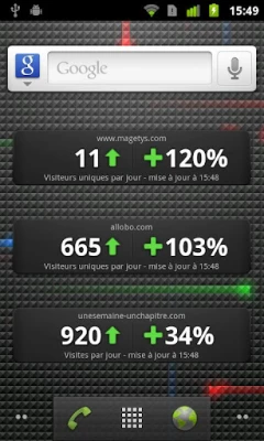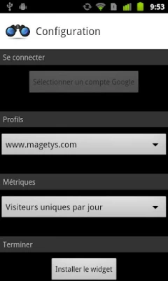 When you install a widget, a configuration screen allows you to connect to your Google Analytics account to select a website and a metric. The configuration is simple and quick. You can install as many widgets as you want on your home screen with different configurations.