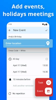Simple Calendar - Daily Planner covers whether you need a robust work calendar, a straightforward day planner, or a comprehensive tool to organize everything from birthdays to business meetings. This app is a breeze to customize, from event reminders to the overall aesthetics of your calendar widgets. Managing single and recurring events is straightforward, making it easy to stay on top of everything that matters to you.