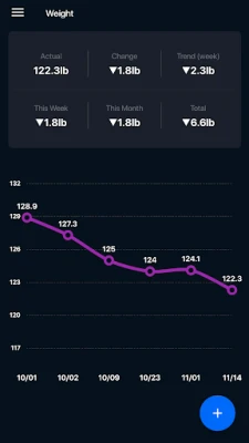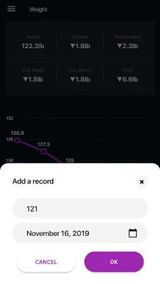 Simple Weight Tracker is a body weight watcher. It stores data provided from scale to watch and analyze weight loss. It will help you to track your body weight while on diet plan and count calories for weight loss. By tracking changes it is easier to learn how to lose weight fast. Chart and statistics help to find out what diet works for you, which diet plans or activities match you best. Test diets like keto, low carb, low calorie diet or intermittent fasting IF. Check effects for lose fat and belly fat to achieve fit weight.