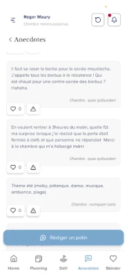 - Actualités et événements sous forme de fil d'actualité - Potins récupérés par la team chaque soir / publier ses potins qui seront en attente de validation par un membre de la team - Page des contacts et informations importante du voyage - Informations importantes sur le voyages et contacts en cas d'urgence