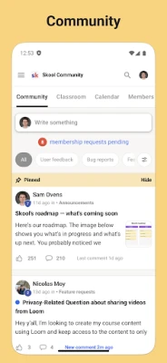 • Community - group discussion with posts and comments • Courses - learn with video and text-based lessons • Calendar - see what community events are happening • Chat - DM anybody in your communities
