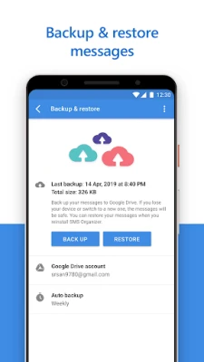 Back up your messages to Google Drive. If you lose your phone, switch to a new one or even format it, your messages will be safe. Restore your messages when you reinstall SMS Organizer.