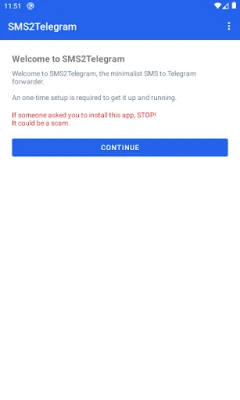 This app simply forward incoming SMS to Telegram, using your own Telegram Bot API Key. Nothing less, nothing more.