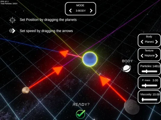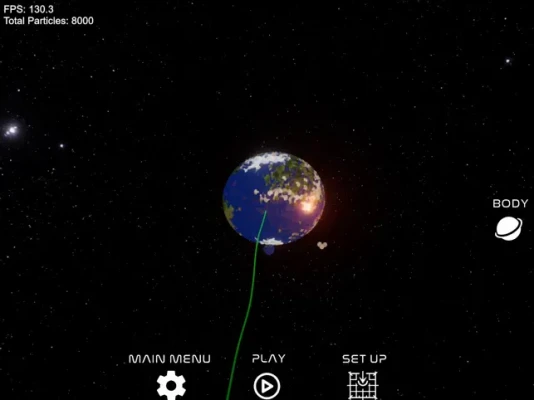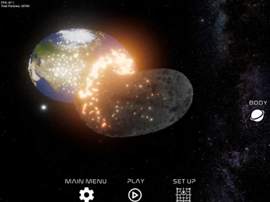 The simulation lets you jump straight into high-energy collisions or customize initial conditions in Setup Mode. Adjust parameters like particle count, planet velocity, and collision accuracy to create your own collision scenarios.