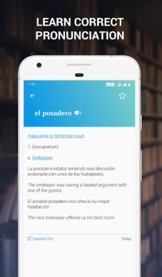 Explore new challenging words each day. You can save the most difficult words to study separately from the ones added daily. If you need to expand your Spanish vocabulary, get this app. A single word can have different meanings. So, we give you all. By clicking on the word, you can get the complete meaning of the word with pronunciation.