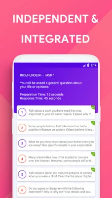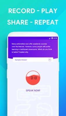 TOEFL® Speaking app make it easy to improve TOEFL® Speaking Score for its users who aiming for 26+ in TOEFL® speaking. This application has many Speaking sample tests for TOEFL®, from where users can practice, record, share and get idea from sample answers.