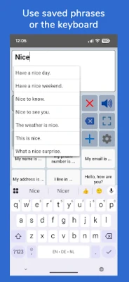 With the app you can create categories and phrases, which are placed on buttons. With these buttons you can create messages that can be shown or spoken (text-to-speech). It is also possible to type any text using the keyboard.
