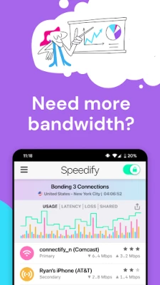 Tired of your audio and video buffering the second you step outside of Wi-Fi range? Speedify bonds your 4G, 5G and Wi-Fi connections together for seamless connectivity. It distributes your web traffic between them as necessary without missing a beat. Secure, easy to use, and compatible with all your favorite streaming services and apps, Speedify is perfect for:
