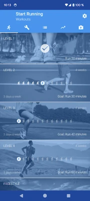 Our workout plan is broken down into 4 achievable levels. Each level has a clear goal for how long you should be able to jog continuously: