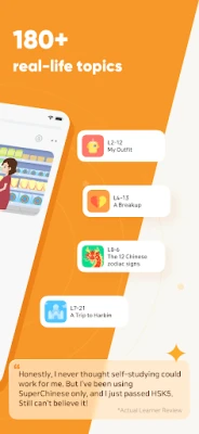 SuperChinese uses advanced AI technology to meet your personal learning style. Lessons are drawn from a wide range of real-life topics, presented in a way that sticks.