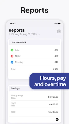 Create reports for earnings, hours per shifts, overtime and shift counting (e.g. vacation days).