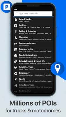 The app offers navigation specially tailored to specifications of: truck / HGV / RV / caravan / motorhome / camper / van / bus / car/ or car with trailer.