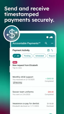Accountable Payments: Make payment requests and securely send or receive money, allowing you to keep track of all shared parenting expenses. Requests and payments are timestamped, and you can also schedule monthly recurring payments.