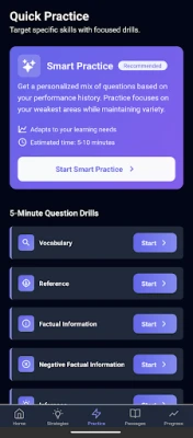 - Progress tracking calculates your expected score and highlights your strengths and weaknesses