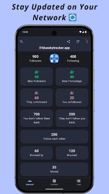 Manage your Bluesky network in real time! Track followers, unfollowers, blocks, mutes, likes, posts, and more — all in one easy-to-use app. Discover which Bluesky lists include your account and explore starter packs featuring your account for greater visibility.