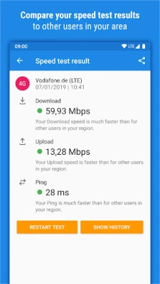 The speed test of the Traffic Monitor shows you the speed and latency of your UMTS, LTE, 5G and Wi-Fi network on a speedometer, separated into upload, download and ping speed. After each test you receive an assessment of your result, comparing it to users in your region. So you can find out if you surf the net faster or slower than the rest of the world. All speed tests are archived with all details and can be accessed anytime and viewed on the integrated map view. The archived data helps you to recognize speed variations quickly.