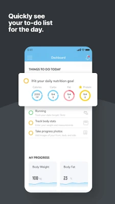 Mit dieser Fitnessapp kannst du verschiedene Programme zum Abnehmen, Zunehmen oder Muskelaufbau erwerben und individuelles Personal Online Coaching starten.