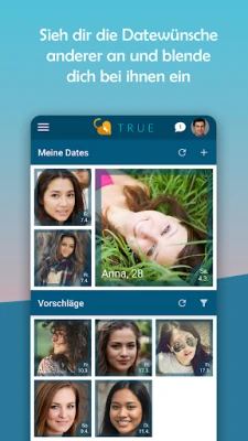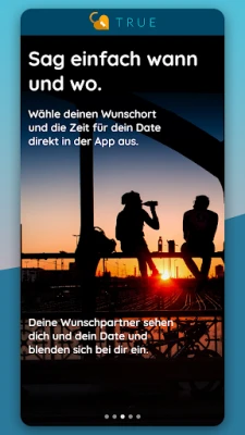 Mit True wollen wir dir eine vollkommen neue Art des Kennenlernens und Datens zeigen: Die App sorgt dafür, dass sich Paare, bei denen sich beide gegenseitig gefallen, sofort im realen Leben kennenlernen, anstatt unzählige oberflächliche Nachrichten auszutauschen.