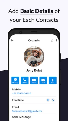 - Easily contacts add and edit information like phone numbers, emails, and photos,create new contact.