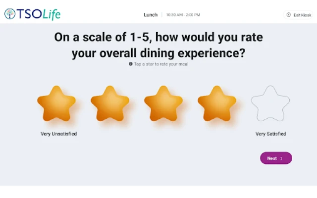 The TSOLife Kiosk mobile app is designed to empower senior living residents and community members to share their thoughts and experiences with staff through real-time feedback. Our app boasts a user-friendly interface and intuitive features, making the process of providing feedback both quick and efficient.