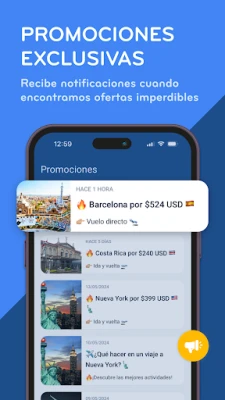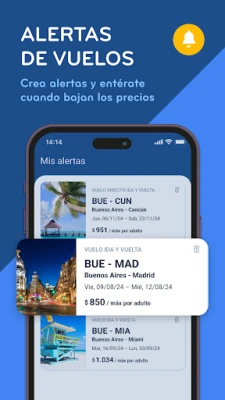 - Genera alertas personalizadas que te avisan cuando baja el precio del vuelo o paquete que te interesa.