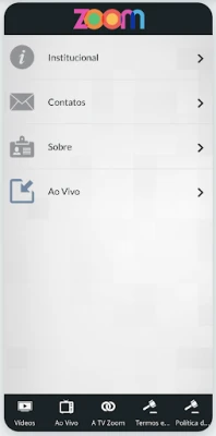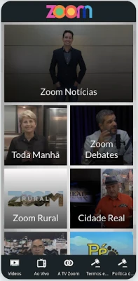 - Ao vivo: a nossa programação no ar, em tempo real, 24 horas por dia no seu celular. - Vídeos: matérias do ZoomTV Jornal e programas na íntegra. - Envie: a sua participação em foto, vídeo ou texto diretamente para a produção.