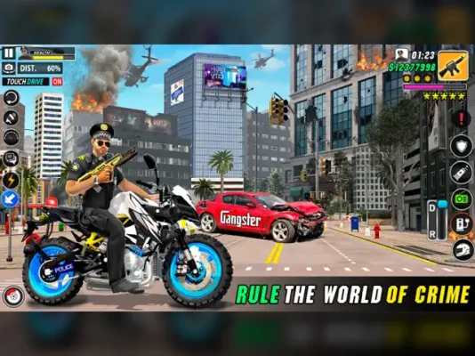 Get ready for exciting police car bike riding & chasing gangster fighter games or Cop motorbike gangster fighting & shooting games 3D! Start fun in an action game where you become a police hero! Drive police bikes & cars chase gangsters crime city adventure simulator games 3D. In this game, your job is to catch criminals who are trying to escape. Use your driving, shooting & fighting skills to stop them in duty police officer gangs fighter game 3D. Each mission has a goal of chasing the bad guys, shooting them if needed, and saving people's lives in the open world gangster adventure fighting games 3D.Explore fun in world city police officer guns shooting games.The game is full of action with car chases, bike racing, shooting gangster & cop hero games