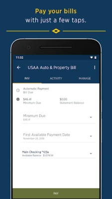 The USAA mobile app allows you to manage your finances, investments, insurance policies and more in a convenient, secure environment.
