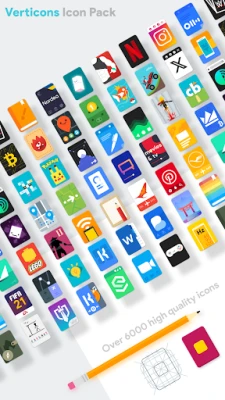 Verticons is a rectangular card material icon pack that loosely sticks to material design guidelines, tweaking them for a fresh user experience. In particular this icon pack avoids use of long shadow and makes extensive use of drop shadows and vivid colors.