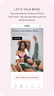 Welcome to the PINK APP: your destination for discovering new trends, exclusive offers, *tons* of cute styles, and more. We literally have it all, from comfy stay-in basics to eye-catching go-out looks. With Bras, Panties, Apparel, Activewear, and Swimwear (not to mention Beauty + Accessories) in sizes ranging from XS-XXL, there’s a lot of something for everyone. Interested? Here’s some other cool stuff we’ve got going on: