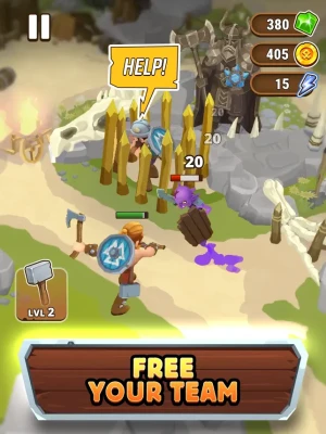 Smash through barricades and destroy goblin camp. Gather resources to upgrade the mighty hammer. Fight off goblins with your fellow vikings, rescue villagers and take back what's yours!
