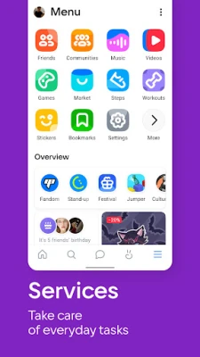 VK unites tens of millions of people by offering unlimited features for communication, entertainment, business and sharing news from anywhere around the world. On the app, you can listen to music, watch videos and clips, keep track of your health, play games, and shop.