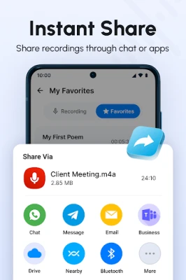 ⊙ Sharing: Send your recordings via email or messaging apps.