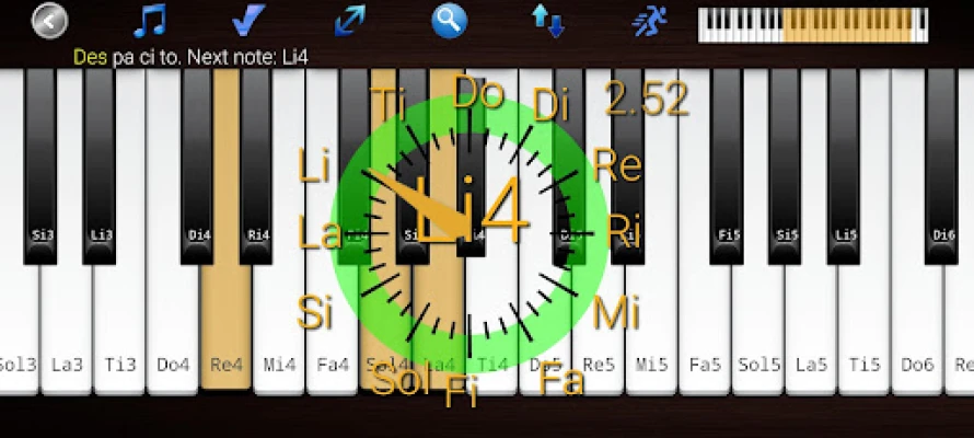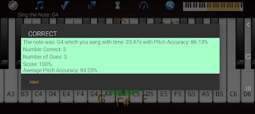 • The piano keys highlight showing which note you should sing and which pitch you are correctly singing.