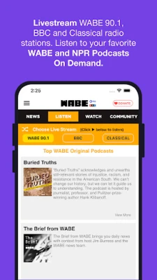 The WABE Public Broadcasting App is brought to you by the people at WABE and Public Media Apps. We work to provide our valued listeners with great solutions to find what you want, when you want it, and where you want it.