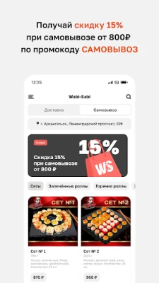 Мобильное приложение «Wabi-Sabi» поможет: — Сделать заказ быстро и с мгновенным подтверждением через приложение; — Получать подарки и кэшбэк с заказов; — Оплатить заказ бонусными баллами; — Быть в курсе актуальных акций и скидок.