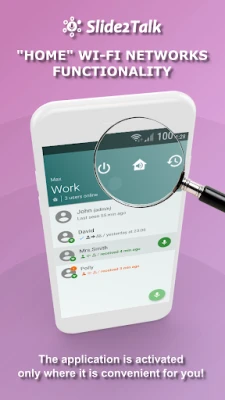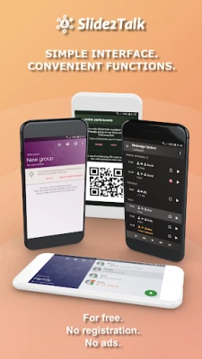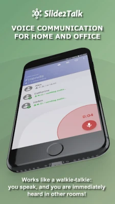 The Slide2Talk (Slide To Talk) is a walkie talkie online, voice communication for home and office. The application allows you to instantly exchange voiсe messages viа the сloud or directly on WiFi networks (even offline without the Internet). The Slide2Talk works as a two way radio (walkie-talkie) with PTT (Push To Talk) function. Incoming audio data are automatically played through the speaker or headset.