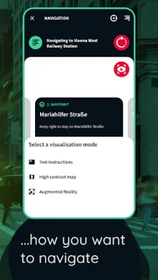 Chose how you want to display your route: Augmented Reality, High Contrast Map, or Text Instructions.