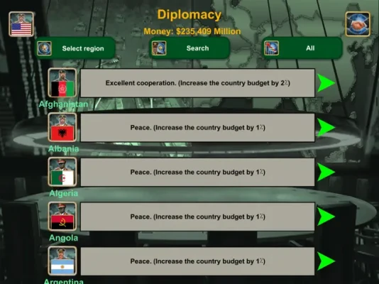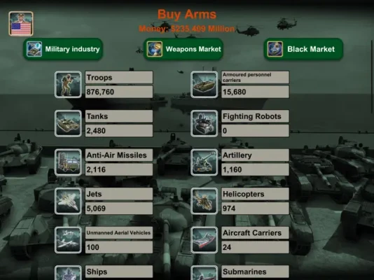 The game offers a wide range of features, including access to global Weapons Suppliers, a Spy Center, a War Room, Diplomats, the United Nations, an Economy system, Technology, and World News Distribution (Economy, Relations, Spy, and War). All this is powered by advanced Artificial Intelligence.
