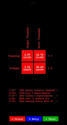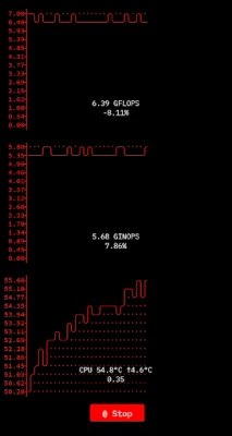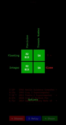 The app calculates how many operations (add, subtract, multiply, divide, etc.) a CPU can perform in a given second with either fractional (floating-point) or integer numbers.