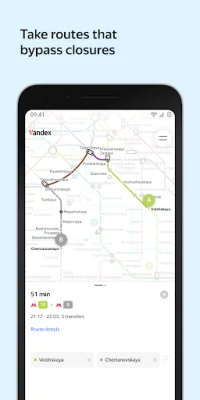 Yandex Metro shows you how long a journey will take, the number of transfers and whether any stations are closed for renovations. It shows which metro car to choose to speed up your trip and not waste time when changing lines.