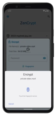 A: ZenCrypt supports encrypting using an alphanumerical password, or using a fingerprint, if your device supports it.