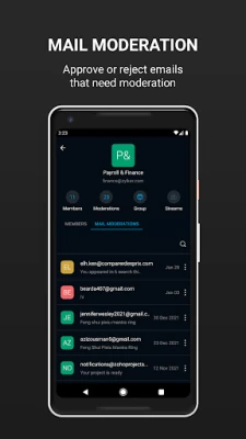 User Management: Add users, reset passwords and change user roles, all on the go Group Management: Add members to a group, remove members from a group and change roles Mail Moderation: Approve/reject emails that need moderation (for those few emails that are too urgent to wait for you to get to your computer) Storage Management: You can add extra storage for a user using the "storage" addon