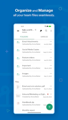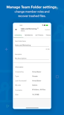 Work as a team: Create Team Folders, add members, and assign role-based access to them. You can modify settings, monitor trash, and restore deleted files with a tap.